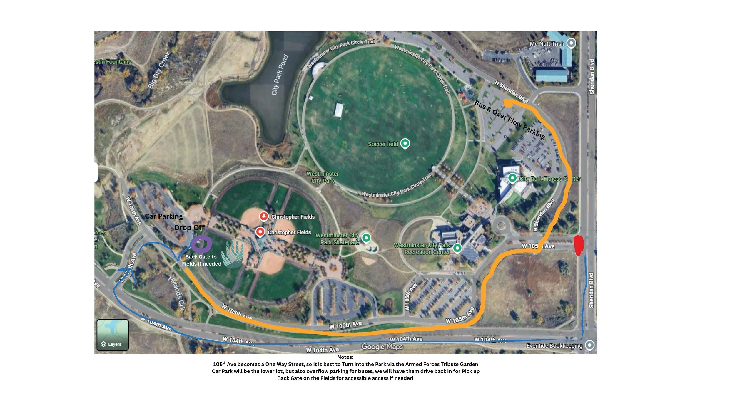 Note: 105 Ave becomes a one-way street, so the best entrance to the park is via the Armed Forces Tribute Garden. Car parking will be in the lower lot, with additional overflow parking available for buses. Buses will return to the entrance area for passenger pick-up. Back gate on the fields for accessible access if needed. See image below!